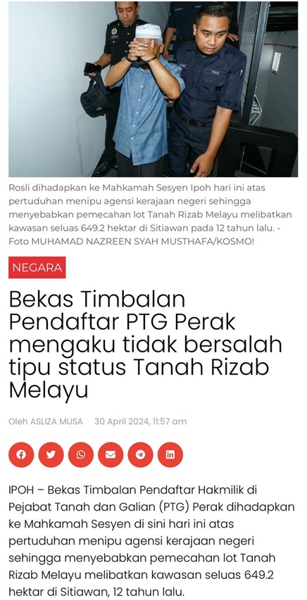 - Rosli Che Mohamed, bekas Timbalan Pendaftar Hak Milik Pejabat Tanah dan Galian (PTG) Perak, mengaku tidak bersalah di Mahkamah Sesyen Ipoh atas pertuduhan menipu Lembaga Tanah Ladang Negeri Perak dengan memalsukan (memperdaya) bahawa tanah seluas ±649.2 hektar bukan Tanah Rizab Melayu, yang kemudian menyebabkan kelulusan pemecahan lot