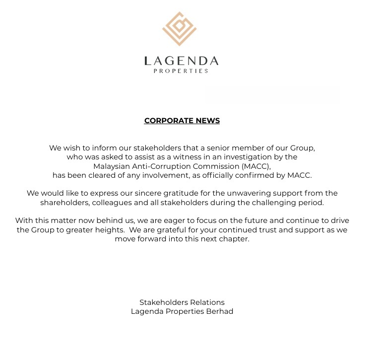 - Lagenda Properties Bhd mengeluarkan makluman rasmi: